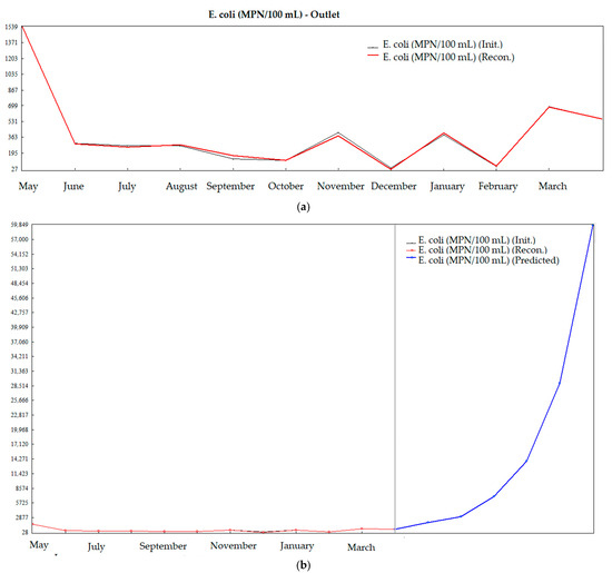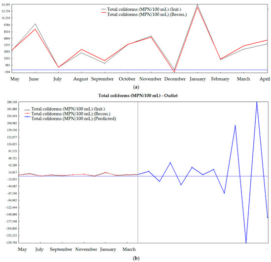 The behavior of the E. coli and total coliform population levels for the outlet effluent showed a tendency to error and overestimation of the final data when predicting a volume of data for the period of one year, with stable and consistent data for the evaluation of a prediction period of up to six months. This study requires a longer time series so that the prediction of the outlet effluent can be performed for a period of one year. The recommendation is to conduct a study with a larger volume of samples.