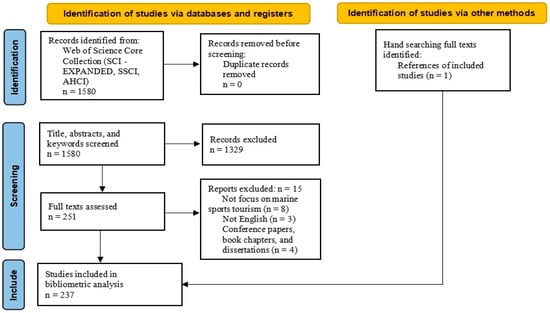 The core collection databases of the Web of Science (including SCI-EXPANDED, SSCI, and A&HCI) were selected as the primary data sources for this study. The search was conducted on 3 July 2024, by the first author (SG) with guidance from a librarian experienced in systematic review methodologies. We did not set a specific earliest publication date, opting instead to use the most comprehensive date range available for each database. The records found spanned from 1939 to 2024. To ensure comprehensive data coverage, we employed a specialized search expression based on existing research [,] TS = (“coastal sports tourism” OR “marine sports tourism” OR “beach sports tourism” OR “seaside sports tourism” OR “coastal tourism” AND “sports” OR “coastal leisure tourism” OR “marine leisure tourism” OR “beach leisure tourism” OR “seaside leisure tourism” OR “coastal leisure” OR “maritime tourism” OR “water skiing” OR “windsurfing” OR “underwater fishing” OR “scuba diving” OR “swimming” OR “marine park tours” OR “marine parks” OR “surfing” OR “canoeing” OR “sailing” OR “rowing” OR “kite surfing” OR “jet skiing”) AND TS = (“tourism” OR “tourist” OR “travel” OR “recreation” OR “hospitality” OR “destination” OR “vacation”) and manually searched the references of systematic review articles on marine and surf tourism to identify additional eligible articles.