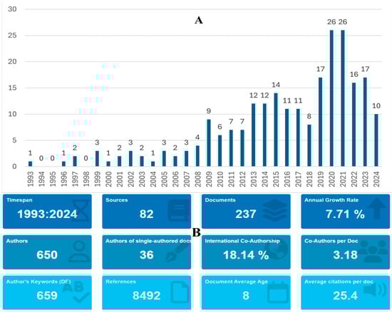(A) Annual output of marine sports tourism research publications. (B) Additional statistics information.