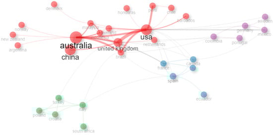 Figure 4 depicts the country-level collaboration network, highlighting international research collaborations. The network reveals that the United States and Australia have extensive collaborative ties with numerous other countries, underscoring their influence and central role in fostering global research in marine sports tourism. This international collaboration is crucial for addressing global challenges in marine sports tourism, such as sustainability and climate change impacts []. China’s rapid growth in research output is also notable, reflecting its increasing academic focus on marine and coastal sports tourism.