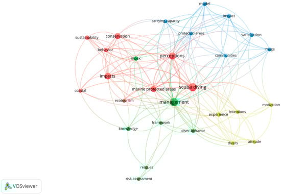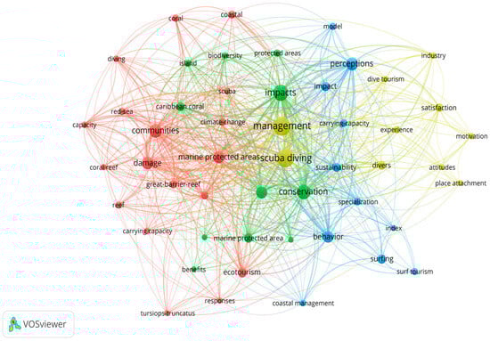 The yellow cluster focuses on the management of marine sports tourism, with a particular emphasis on scuba diving. The keywords in this cluster, including “management”, “scuba diving”, “satisfaction”, “industry”, and “place attachment”, reflect the comprehensive approach needed to balance environmental conservation with the economic and experiential aspects of tourism.