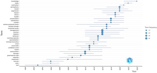 The analysis of research trends through topic trend analysis provides a comprehensive understanding of how thematic focuses in the field of marine sports tourism have evolved over time. Figure 6 illustrates the trend topics extracted from the “Keywords Plus” field, highlighting the temporal progression of key research themes within the domain. The figure displays the time span (in years) for which each keyword was in use. The size of the bubbles within each line represents the frequency of keyword occurrence, with larger bubbles indicating higher frequency.