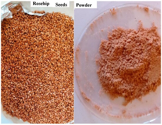 High-quality RSs were carefully selected from a forest near Karabuk University in Turkey. The seeds underwent a rigorous preparation process to ensure their suitability for the study. Initially, any adhering flesh from the RSs was meticulously removed through a thorough rinsing procedure utilizing distilled water. Subsequently, the cleaned seeds were subjected to a precise drying process to achieve optimal dryness. Initially, they were allowed to air-dry at ambient room temperature, followed by a more controlled drying phase. During this phase, the seeds were placed in an oven for 8 h, maintaining a constant temperature of 50 ± 1 °C. This meticulous drying regimen guaranteed the complete elimination of moisture, rendering the seeds ideal for further processing. The next stage involved manually de-husking the dried RSs, followed by a finely detailed grinding process utilizing a laboratory mortar. This process effectively reduced the seeds into fine particles. For the final refinement, a specialized grinder, specifically the Retsch RS 200, was employed to further process the crushed rosehip seed stones. This step yielded a consistent and homogeneous powder characterized as RSP. The resulting powder, with its uniform and delicate texture, served as a natural coagulant of choice for the wastewater treatment procedures conducted in this study. This naturally derived coagulant was instrumental in facilitating the coagulation–flocculation process, contributing to the study’s research objectives and enhancing the eco-friendly approach to wastewater treatment (refer to Figure 1 for a visual representation).