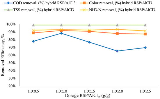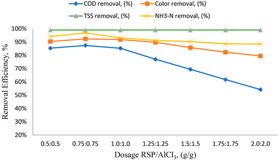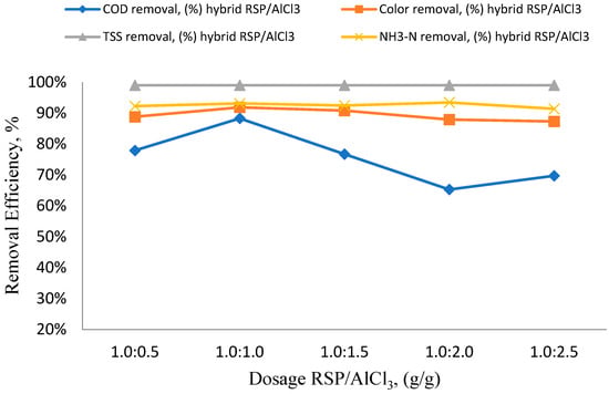 Examining the impact of different hybrid coagulant dosages on the elimination of COD, color, TSS, and NH3-N from wastewater coming from the iron–steel (IS) sector was the goal of this study. These experiments were conducted at an initial pH of 8, and Figure 2 shows the visual representation of the results. With a hybrid coagulant dosage of 1:1 (g/g), the highest removal efficiency was recorded, with removal rates of 88.29% for COD, 91.85% for color, 99.00% for TSS, and 93.11% for NH3-N. To put things in perspective, these results were contrasted with the removal efficiencies obtained via RSP alone, as shown in a prior study. This comparison demonstrates how well the hybrid coagulant performs in terms of improving the treatment efficiency for several important wastewater characteristics [].