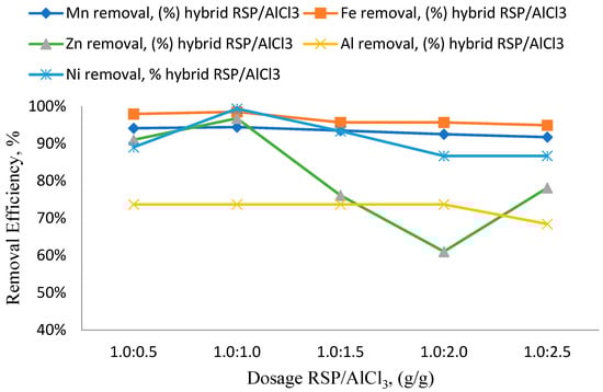 Impact of RSP/AlCl3 hybrid coagulant dosage on the removal of heavy metals Fe, Mn, Al, Zn, and Ni (pH: 8).