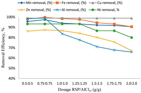 Therefore, this study identified the optimum hybrid RSP/AlCl3 concentration as 0.75:0.75 (g/g). At this concentration, the removal efficiency for heavy metals exhibited a positive trend. Increasing the dosage beyond this point reduced removal efficiency due to the charge reversal phenomenon. This highlights the critical role of dosage optimization in effectively removing heavy metals from IS factory wastewater.