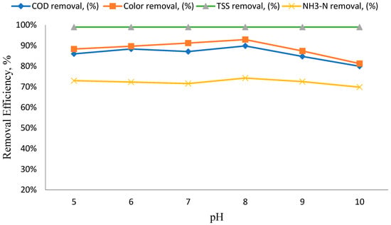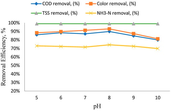 Impact of pH on the removal of COD, TSS, and ammonia–nitrogen (NH3-N).
