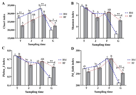 Differences in the alpha diversity indices of phytoplankton between RM and RF groups during different rice growth stage. (A) Chao1 index; (B) Shannon index; (C) Pielou_J index; (D) PD_faith index. Different uppercase letters indicate differences within the RF group among different rice growth stage; different lowercase letters denote differences within the RM group among different rice growth stage. The asterisks (*, **) indicate a difference between the RM and RF groups at the same sampling time. Results are expressed as mean ± SE (standard error). T, tillering stage; J, jointing stage; F, flowering stage; G, grain-filling stage.