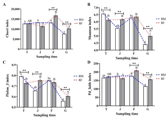 Differences in the alpha diversity indices of microzooplankton between RM and RF groups during different rice growth stage. (A) Chao1 index; (B) Shannon index; (C) Pielou_J index; (D) PD_faith index. Different uppercase letters indicate differences within the RF group among different rice growth stage; different lowercase letters denote differences within the RM group among different rice growth stage. The asterisks (**) indicate a difference between the RM and RF groups at the same sampling time. Results are expressed as mean ± SE (n = 10). T, tillering stage; J, jointing stage; F, flowering stage; G, grain-filling stage.