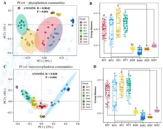 Bray–Curtis distance was used to evaluate the variations of phytoplankton and microzooplankton communities among different groups. The PCoA demonstrated that there was a significant difference in the phytoplankton community among different groups (ANOSIM: R = 0.8024, p = 0.001) (Figure 3A). Concurrently, the group distance analysis indicated a more pronounced effect of rice–carp coculture on phytoplankton communities. Moreover, the composition of the phytoplankton community exhibited significant variations across different growth stages of rice (Figure 3B). Similar to the phytoplankton community, microzooplankton communities from different groups clustered separately. Significant differences in the composition of microzooplankton communities between different groups were confirmed (ANOSIM: R = 0.838, p = 0.001) (Figure 3C). Furthermore, the Bray–Curtis distances of microzooplankton communities in RF group were significantly larger than those in RM, and the composition of the microzooplankton community exhibited significant variations across different growth stages of rice (Figure 3D).