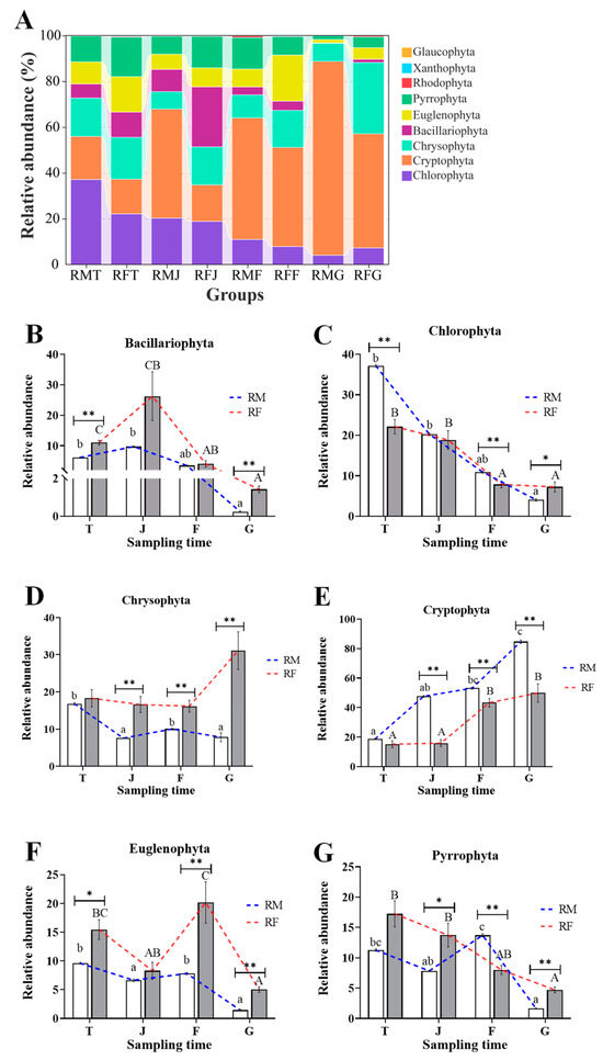 The effect of rice–carp coculture on the composition and abundance of phytoplankton at the phylum level during various rice growth stages. (A) Composition of phytoplankton at the phylum. (B) Bacillariophyta. (C) Chlorophyta. (D) Chrysophyta. (E) Cryptophyta. (F) Euglenophyta. (G) Pyrrophyta. Different uppercase letters indicate differences in the RF group among different rice growth stages; different lowercase letters denote differences in the RM group among different rice growth stages. The asterisks (*, **) indicatea difference between the RM and RF groups at the same sampling time. Results are expressed as mean ± SE (n = 10). T, tillering stage; J, jointing stage; F, flowering stage; G, grain-filling stage.