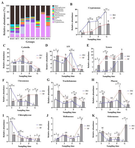 The effect of rice–carp coculture on composition and abundance of phytoplankton at the genus level during various rice growth stages. (A) Composition of phytoplankton at the genus. (B) Cryptomonas. (C) Cyclotella. (D) A31. (E) Synura. (F) Charoomonas. (G) Trachelomonas. (H) Phacus. (I) Chlorophyceae. (J) Mallomonas. (K) Ochromonas. Different uppercase letters indicate differences in the RF group among different rice growth stages; different lowercase letters denote differences in the RM group among different rice growth stages. The asterisks (*, **) indicate a difference between the RM and RF groups at the same sampling time. Results are expressed as mean ± SE (n = 10). T, tillering stage; J, jointing stage; F, flowering stage; G, grain-filling stage.
