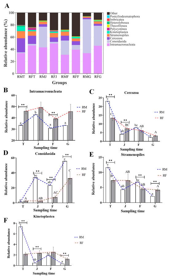 The effect of rice–carp coculture on the composition and relative abundance of microzooplankton at the phylum (or subphylum and class) level during various rice growth stages. (A) Top 10 microzooplankton at the phylum (or subphylum and class). (B) Intramacronucleata. (C) Cercozoa. (D) Conoidasida. (E) Stramenopiles. (F) Kinetoplastea. Different uppercase letters indicate differences in the RF group among different rice growth stages; different lowercase letters denote differences in the RM group among different rice growth stages. The asterisks (**) indicate a difference between the RM and RF groups at the same sampling time. Results are expressed as mean ± SE (n = 10). T, tillering stage; J, jointing stage; F, flowering stage; G, grain-filling stage. Here, species in the classes Imbricata (class) and Thecofilosea (class) were classified separately from those in the Cercozoa phylum, with the data for Imbricata and Thecofilosea being distinct from those of Cercozoa; species in the Intramacronucleata (subphylum) and Postciliodesmatophora (subphylum) were independently analyzed from those in the Ciliophora phylum, with the data for Intramacronucleata and Postciliodesmatophora being distinct from those of Ciliophora; species in the Kinetoplastea (class) were analyzed independently from the Euglenozoa phylum; species in Conoidasida (class) were independently analyzed from those in the Apicomplexa phylum, with the data for Conoidasida being distinct from those of Apicomplexa.