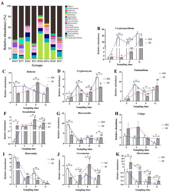 The effect of rice–carp coculture on the composition and relative abundance of microzooplankton at the genus level during various rice growth stages. (A) Top 15 microzooplankton at the genus level. (B) Cryptosporidium. (C) Halteria. (D) Cryptocaryon. (E) Tintinnidium. (F) Strombidium. (G) Bicosoecida. (H) Coleps. (I) Heteromita. (J) Cercomonas. (K) Obertrumia. Different uppercase letters indicate differences in the RF group among different rice growth stages; different lowercase letters denote differences in the RM group among different rice growth stages. The asterisks (*, **) indicate a difference between the RM and RF groups at the same sampling time. Results are expressed as mean ± SE (n = 10). T, tillering stage; J, jointing stage; F, flowering stage; G, grain-filling stage.