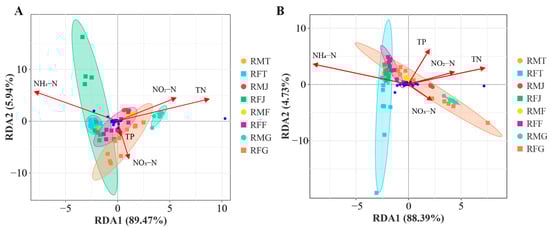 Results from the RDA indicate that the environmental factors identified in this study explained 95.41% of the variance observed in phytoplankton communities within paddy water. Significant correlations were observed between the phytoplankton communities and most environmental variables, with the exception of total phosphorus (TP) (Figure 8A, Table S5, p < 0.05). Similarly, environmental factors such as nitrite–nitrogen (NO2–N), ammonium–nitrogen (NH4–N), total nitrogen (TN), and TP showed significant correlations with the microzooplankton community structure (Figure 8B, Table S6, p < 0.05). Additionally, the plankton communities demonstrated notable variations across different farming models and culture stages.