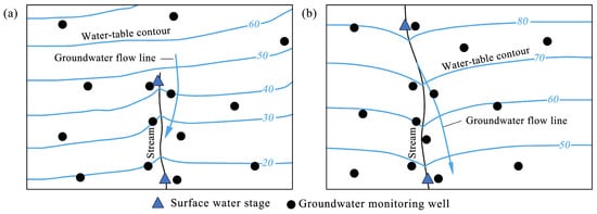 Schematic diagram of the contour characteristics of groundwater–surface water interactions [31], where (a) represents gaining river and (b) represents losing river.