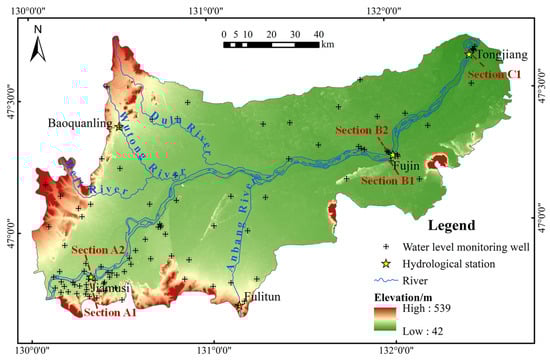 This study integrates hydraulic, hydrochemical, and isotopic analyses to achieve its objectives, utilizing data that include both hydraulic and hydrogeochemical measurements. Water quality samples were collected from the Songhua River and groundwater in September 2020, and the water samples for stable isotopes (deuterium (D) and oxygen-18 (18O)) were collected in September 2023. The hydrochemical dataset includes 43 samples (9 surface water and 34 groundwater), while the isotope dataset includes 39 samples (12 surface water and 27 groundwater). Three rainfall samples were also collected in September 2023 for stable isotope testing near Jiamusi, Puyang, and Fujin. The sampling profiles were oriented both parallel and perpendicular to the flow directions of the groundwater and river water (Figure 1). This approach helps to explore the interactions between the surface water and groundwater. The annual water levels observed in 2020 were collected from three hydrological stations (Jiamusi Station, Fujin Station, and Tongjiang Station) along the Songhua River and from 98 groundwater monitoring wells across the study area (Figure 3). These data represent the most current and comprehensive hydraulic data available and were provided by Heilongjiang Provincial Water Conservancy and Hydroelectric Power Investigation, Design, and Research Institute.