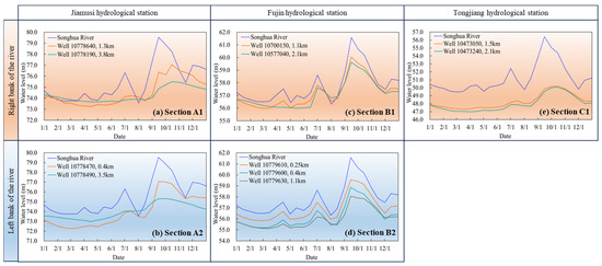 Figure 4 reveals that the water levels of the Songhua River at each observation cross-section were almost consistently higher than those of the adjacent groundwater throughout the year. The groundwater levels closely followed the fluctuations of the river water levels, but with reduced amplitude and a more delayed response. This indicates a perennial-recharge-type groundwater regime [46,47,48]. The peaks and amplitudes of the groundwater level fluctuations gradually decreased with increasing distance from the river. In the two cross-sections from the Jiamusi hydrological station (Sections A1 and A2), it was observed that, beyond 3.5 km from the riverbank, the groundwater level fluctuations no longer closely synchronized with the river level changes. Moreover, from January to June, the groundwater levels beyond 3.5 km from the riverbank were higher than those closer, deviating from the usual pattern of lower groundwater levels farther from the river. This suggests that groundwater farther from the river is only influenced by the river during the flood season. In the two cross-sections from the Fujin hydrological station (Sections B1 and B2), the fluctuations in the groundwater levels at different distances from the river showed a strong correlation with the river’s fluctuations. This correlation indicates a close hydraulic connection between the Songhua River and the adjacent groundwater here, with a significant recharge influence. At Tongjiang hydrological station (Section C1), the groundwater levels beyond 1.5 km from the river showed a notable difference from the river levels. Although these groundwater levels reflected some influence from the surface water, the peaks were not prominent, and the fluctuations were minimal.