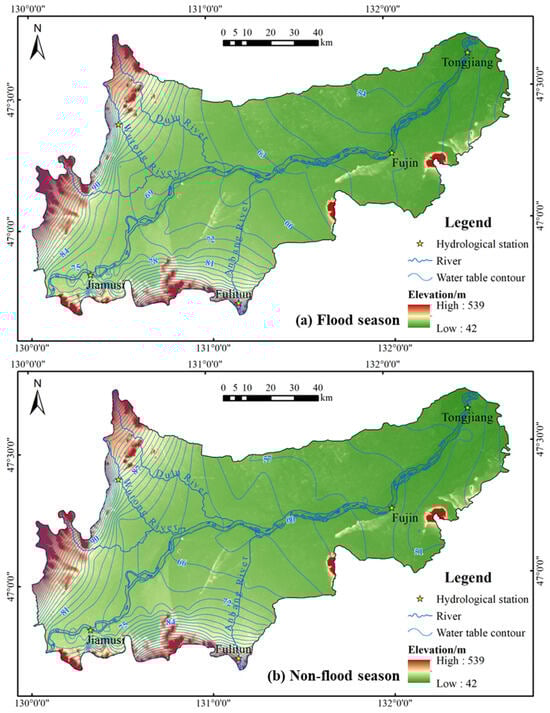 Water table contour maps for (a) the flood season (1 May 2020) and (b) the non-flood season (1 September 2020).
