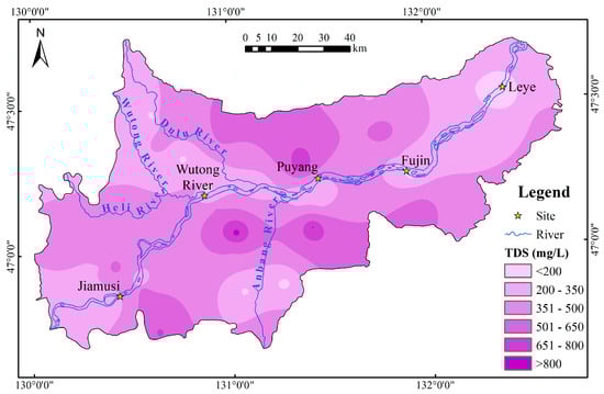 Figure 6 shows that the TDS of the groundwater on both sides of the river is lower than that found in areas far from the river. Low-TDS zones are observed near the western Jiamusi area, the northwestern confluences (Dulu River and Wutong River), the eastern Leye area, and the southern upstream Anbang River area. Conversely, high TDS zones are found on both sides of the Songhua River near Puyang. Given the low salinity (averaging 171.13 mg/L) and the small data variability of the surface water, this distribution pattern may indicate that the adjacent groundwater is recharged by lower-salinity river water, leading to a mixed dilution effect.