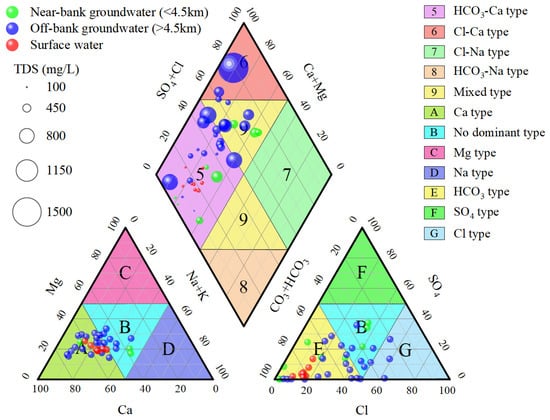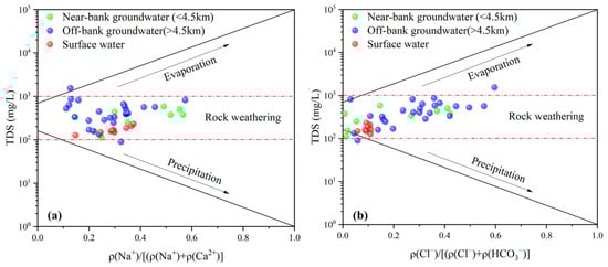 The groundwater samples were categorized as Near-bank groundwater and Off-bank groundwater based on a 4.5 km distance from the riverbank to better analyze the interaction between the Songhua River and the groundwater. As shown in Figure 7, Ca2+ and HCO3− dominate the ionic composition of the river, with all river water samples belonging to the HCO3-Ca type. The Near-bank groundwater also shows Ca2+ and HCO3− as dominant ions, with hydrochemical types primarily being HCO3-Ca and Mixed. Most Near-bank groundwater samples are close to the surface water samples on the Piper diagram, and their TDS values are also very similar. High TDS waters are primarily found in Off-bank groundwater, which comprises numerous samples spread across the study area. These samples, having experienced various hydrogeochemical processes, are the most dispersed on the diagram. The dominant ions in the Off-bank groundwater are Ca2+, HCO3−, and Cl−, with a few low-TDS HCO3-Ca-type samples, but the majority are Mixed or Cl-Ca types. The diversity of hydrochemical types is shaped by various hydrogeochemical environments, which can be partially interpreted using the Gibbs diagram (Figure 8) [43]. Compared to the Songhua River water, the basin’s groundwater undergoes more extensive water–rock interactions within the aquifer, with the Off-bank groundwater being more significantly influenced by water–rock interactions than the Near-bank groundwater. The Off-bank groundwater is also subject to evaporative concentration. River water and some Near-bank groundwater are recharged by rainfall. Furthermore, excessive fertilization, sewage discharge, and other human activities in this large agricultural production base may directly or indirectly impact regional water quality [50].