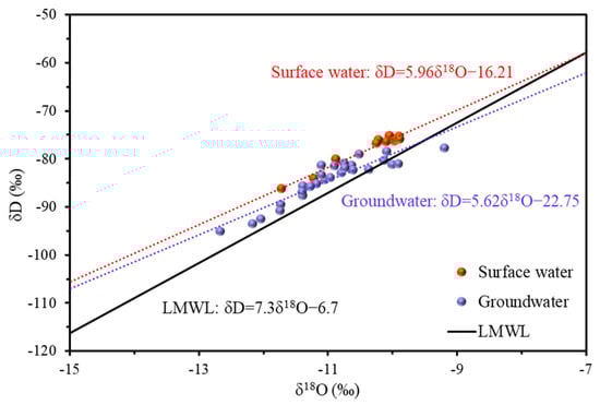 The δD–δ18O relationship of isotopic samples: the red and blue dotted lines represent the fitted δD–δ18O relationship lines for surface water samples and groundwater samples, respectively.