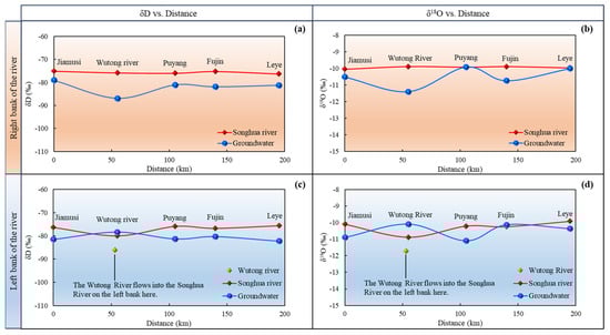Stable isotope variations in surface and groundwater along the river on both the left and right banks: the horizontal axis represents the distance from the upstream boundary of the river within the study area, while the vertical axis represents the isotope values. (a) δD changes on the right bank of the Songhua River; (b) δ18O changes on the right bank; (c) δD changes on the left bank; (d) δ18O changes on the left bank.