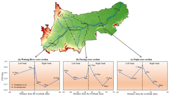 Based on the distribution of the isotope samples, three cross-sections at the Wutong River, Puyang, and Fujin were selected in order to analyze stable isotope variations. Given the similar and correlated variation patterns between D and 18O, and the more stable reactivity of 18O, only 18O was analyzed in detail.