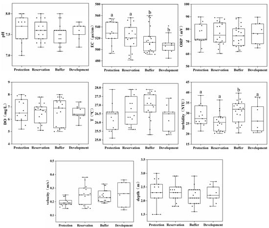 Distribution of the physical and chemical indicators of water bodies across different water functional zones. (Annotations a and b indicate significant differences between the two).
