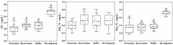 This study analyzed the distribution of carbon, nitrogen, and phosphorus contents in sediments from different water functional areas. Figure 4 shows the measurement results of the sediment carbon, nitrogen, and phosphorous indicators. The average organic carbon contents in the protected, reserve, buffer, and development and utilization zones were 840, 1921, 3829, and 3754 mg/kg, respectively. The average TN contents were 411, 1865, 1280, and 1481 mg/kg, respectively. The average total phosphorous contents were 134, 433, 515, and 1453 mg/kg, respectively.