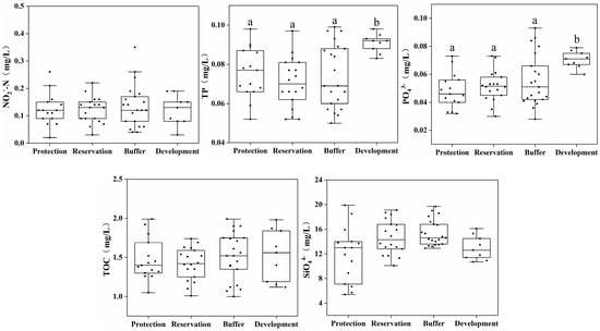 This study analyzed the concentration distribution of biogenic substances such as TN, NH4+-N, NO3−-N, NO2−-N, TP, and PO43− in four water functional zones. Figure 3 shows the results of the water source material indicators. The average TN, NO3−-N, TP, and PO43− concentrations in the water of the development and utilization zone were 3.39, 2.28, 0.091, and 0.072 mg/L, respectively, which are significantly higher than those in the protected, reserve, and buffer zones (p < 0.05). The concentrations of NH4+-N, NO2−-N, TOC, and SiO44− differed insignificantly between the different water functional zones.
