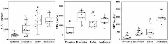 Distribution of carbon, nitrogen, and phosphorus contents in sediments from different water functional zones. (Annotations a, b, and c indicate significant differences between each pair).