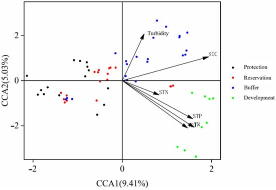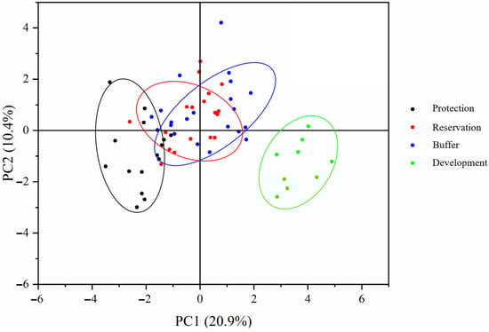 To investigate the comprehensive impact of the different water functional zones on environmental factors in the Jiangsu section of the Yangtze River, a PCA was conducted on the physical and chemical properties, biogenic substances, and sediment carbon, nitrogen, and phosphorus indicators of the protected, reserved, buffer, and development and utilization zones. As shown in Figure 5, the PC1 axis explains 20.9% of the changes in environmental factor composition, whereas the PC2 axis explains 10.4%. The sampling points of the four water functional zones in the Jiangsu section of the Yangtze River were relatively concentrated. Comparing the clustering of the sampling points in the protected, reserve, buffer, and development and utilization zones, significant differences were found between the two axes (ANOSIM, p < 0.05). This indicates that the composition of environmental factors significantly differed among the different water functional zones, further demonstrating that the delineation of water functional zones affects the heterogeneity of the water environment.