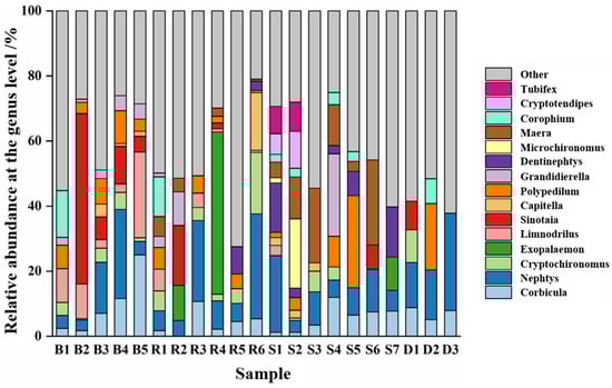 Relative abundance of benthic animal communities in different water functional zones at the genus level. B denotes the protected zone, R denotes the reserved zone, S denotes the buffer zone, and D denotes the development and utilization zone.