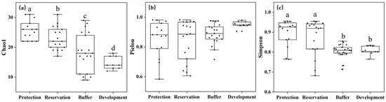 Differences in the alpha diversity index across different water functional zones (Annotations a, b, c and d indicate significant differences between each pair). (a) Chao1; (b) Pielou; (c) Simpson.