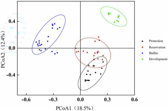 A PCoA was used to cluster the benthic animal community structure at each adoption point. As shown in Figure 8, the explanatory power of the PCoA1 axis for changes in benthic community structure was 18.5%, whereas that of the PCoA2 axis was 12.4%. The sampling points in the four water functional zones of the Jiangsu section of the Yangtze River were relatively concentrated, and the benthic animal community structures at each sampling point in these zones were similar. A further comparison of the clustering of sampling points in the protected, reserved, buffer, and development and utilization zones revealed significant differences (ANOSIM, p < 0.05) in the benthic community structure between each pair of the four water functional areas, indicating significant differences in the benthic community structure in the different water functional zones.