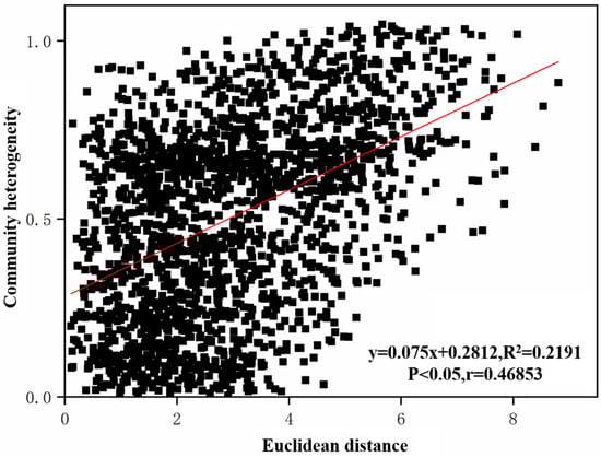 To explore the important factors affecting the structural changes in benthic animal communities in the Jiangsu section of the Yangtze River, this study conducted a correlation analysis between the changes in benthic animal community structure and the environmental heterogeneity of the water and sediment. As shown in Figure 9, the changes in benthic community structure were significantly positively correlated with changes in environmental heterogeneity (r = 0.47, p < 0.05), indicating that the differences in benthic community structure increased significantly with an increase in the differences in environmental factors, suggesting that environmental heterogeneity affected the benthic community structure in the Jiangsu section of the Yangtze River.