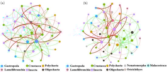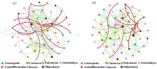 To explore the interspecies interactions of benthic animal communities, this study constructed an ecological network of benthic animal communities in the different water functional zones of the Jiangsu section of the Yangtze River at the taxonomic level (Figure 11). As shown in Figure 11a, six species, including Gastropoda, Crustacea, Polychaeta, and Entomophthorales, were found in the protected zone network. As shown in Figure 11b, nine species, including Gastropoda, Crustacea, Ironworms, and Malacostraca, were found in the reserve zone. As shown in Figure 11c, seven species, including Gastropoda, Oligochaeta, Polychaeta, and Entomophthorales, were found in the buffer zone. As shown in Figure 11d, seven species, including Branchiopsida, Oligochaeta, Polychaeta, and Entomophthorales, were found in the development and utilization zone. Node size is related to connection number (i.e., degrees), with more connections resulting in larger nodes. Figure 11 shows that the gastropod class in the protected zone has the most connected relationships in the ecological network. The crustaceans in the reserve zone have the most connected relationships in the ecological network. Both the buffer and the development and utilization zones are the most interconnected in the ecological network of insects.