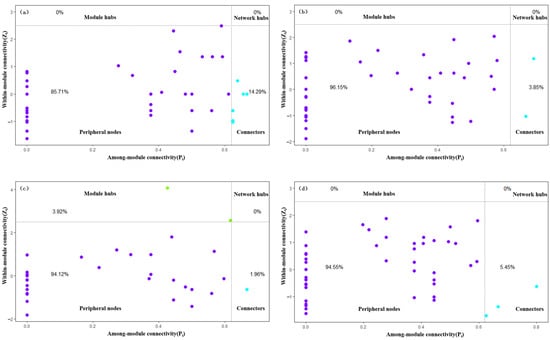 Zi–Pi diagram of benthic animals in different water functional zones. (a) Protected, (b) reserve, (c) buffer, (d) development and utilization zones. The numbers in the figure represent the proportions of the four node types. (Purple is the point inside the peripherals, fluorescent blue is the point inside the connectors, and green is the point inside the module hubs).