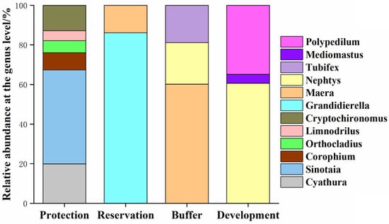 Through a taxonomic analysis, the composition and relative abundance changes in benthic animal species at the genus level can be obtained (Figure 6). A total of 15 genera of dominant benthic animals were found in the Jiangsu section of the Yangtze River, and there were certain differences in the relative abundance of species in the different water functional zones. For example, the relative abundance of Limnodrilus, Sinotaia, Nephtys, and Polypedilum was highest in the protected zone, whereas that of Sinotaia, Nephtys, Exopalaemon, and Cryptochironomus was highest in the reserved zone. The relative abundance of Nephtys, Dentinephtys, Polypedilum, and Grandidierella was highest in the buffer zone, whereas that of Nephtys and Polypedilum was highest in the development and utilization zone.
