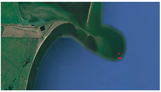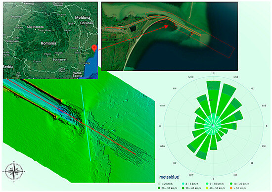 As previous studies [18,19,20,21,22,23,24,25,26] have shown, the Sulina bar area is significantly influenced by the transport of fine alluvial material along the Sulina Channel and by wind-induced currents and waves in the Black Sea. These processes result in a prominent accumulation zone for alluvial material near the mouth and submersible dams in the sea.