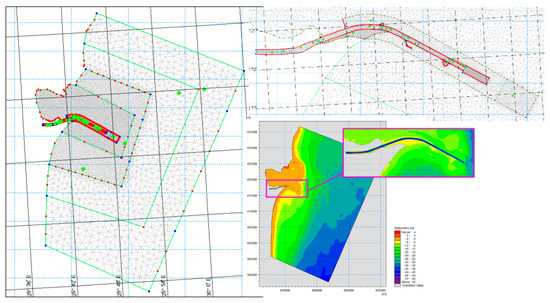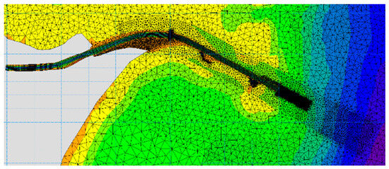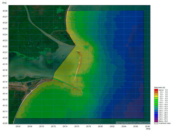 This domain was chosen to capture the interactions between large-scale wave and current patterns in the Black Sea and their influence on sediment transport and navigational conditions within the Sulina Channel. The model grid was generated using the MIKE 21 Flexible Mesh Spectral Wave (SW) model, ensuring a wide enough area to provide reliable boundary conditions for smaller-scale models focusing on the Sulina mouth and bar area.