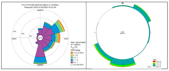 The wave rose at P1 (Figure 5(left)) is a significant source of information, providing insights into significant wave heights (Hm0) and mean wave directions (MWD). It is accompanied by the current rose, presented in Figure 5(right)) which gives indications about the current directions and intensity.