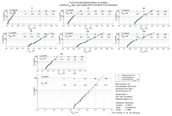 The main wave direction is between 0° N and 180° N, with the highest waves predominantly from 60° N–120° N sector. The information provided by the wave rose is presented in Table 1. Figure 6 shows the wave heights (Hm0) for the relevant MWDs from 0°N to 180°N in 30° intervals and for the ominidirectional directions. Among the various distribution functions tested, the two-parameter Weibull distribution (fitted using the least squares methods and a threshold value corresponding to the average annual peak (λ = 1)) provided the best model for wave height data over the 41 years for which wave information is available.
