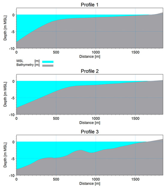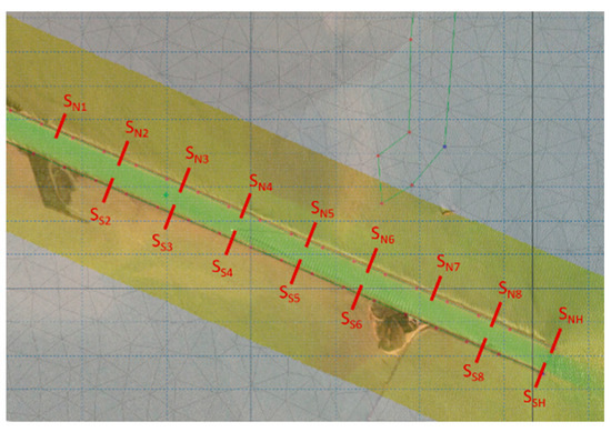 Sections were selected at the beginning of the dikes into the sea and upstream, ensuring that a variety of wave heights and cross-sectional characteristics were captured. The two sections at the sea entrance (dike heads) are designated as SNH (north) and SSH (south). The analysis of the dike sections utilized the available LIDAR data, which included the most recent and detailed measurements from the project’s survey campaign (2023) providing crucial information on the actual dikes’ dimensions and slopes. The SS1 to SS6 sections (located on the southern dike) have recorded water levels lower than the terrain elevation and, therefore, were not considered in the calculation of wind-generated wave loads on the southern side.
