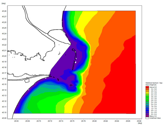 Specific wave events were simulated using a local wave model to provide extreme wave conditions in the Sulina Channel area for stability analysis. Additionally, a 10-year simulation of spectral waves (from 1 January 2011 to 31 December 2020) was conducted to establish a database to assist in calculating littoral sediment transport processes.
