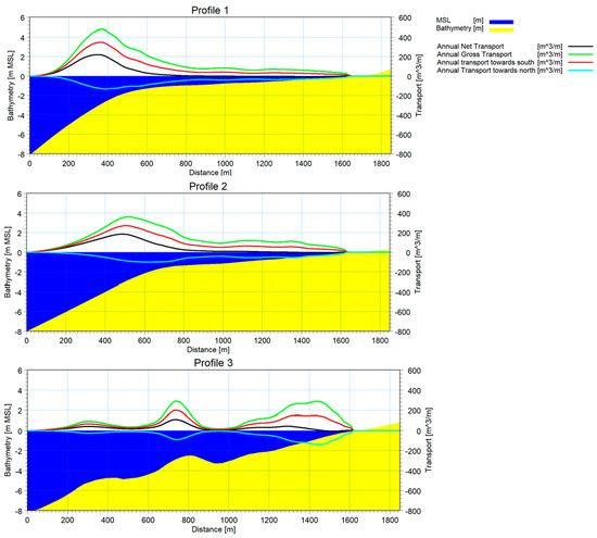 For sediments with a median diameter (D50) of 0.15 mm, the net transport capacities (the difference between transport capacities in both directions, N-S and S-N) across the three modeled profiles range from approximately 40,000 m3/year to 70,000 m3/year. The predominant direction of transport for all three profiles is from north to south towards the Sulina Channel. The annual gross transport capacities range from 150,000 m3/year to 230,000 m3/year.