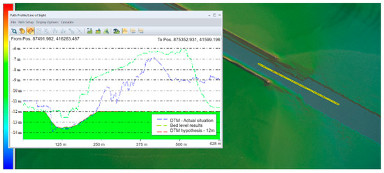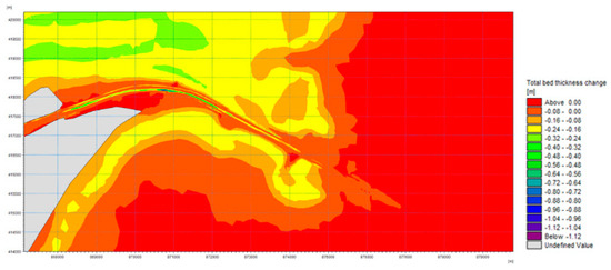 The model results indicate that a vessel with a draught of 11.5 m transiting the new navigable channel generates additional erosion due to the currents produced by the propellers. The results show that this additional erosion generally occurs within a 30–50 cm range, with only a few areas where these values are exceeded (Figure 19).