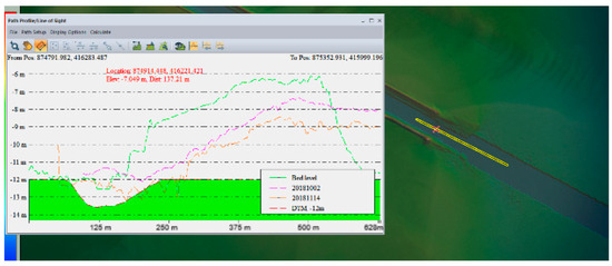 The results show sediment deposition in the Sulina Channel’s discharge area into the Black Sea. A representative image shows bed elevation changes from −12.0 m to about −7.3 m. The sediment deposition dynamics were analyzed in various scenarios, with estimates for required maintenance volumes. Figure 17 shows, in the longitudinal profile through the bar, the differences between the results obtained from the modeling (green line), the topo-bathymetric data obtained in the project campaign (blue line), and the processed file in which the fairway level has been established as −12 m (red line).