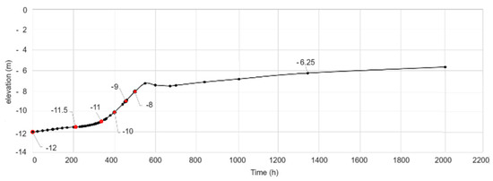 Regarding the sediments recolonization, the results show that the Sulina Channel mouth area is highly dynamic. The particles resedimentation occurs quite rapidly, with the water depth varying from −12 m to the stability depth of around −7 m in one to two months. Figure 20 presents the riverbed evolution in time in a representative area of the bar. Remark that about 800 h after dredging, the depth to the riverbed is above −7 m.